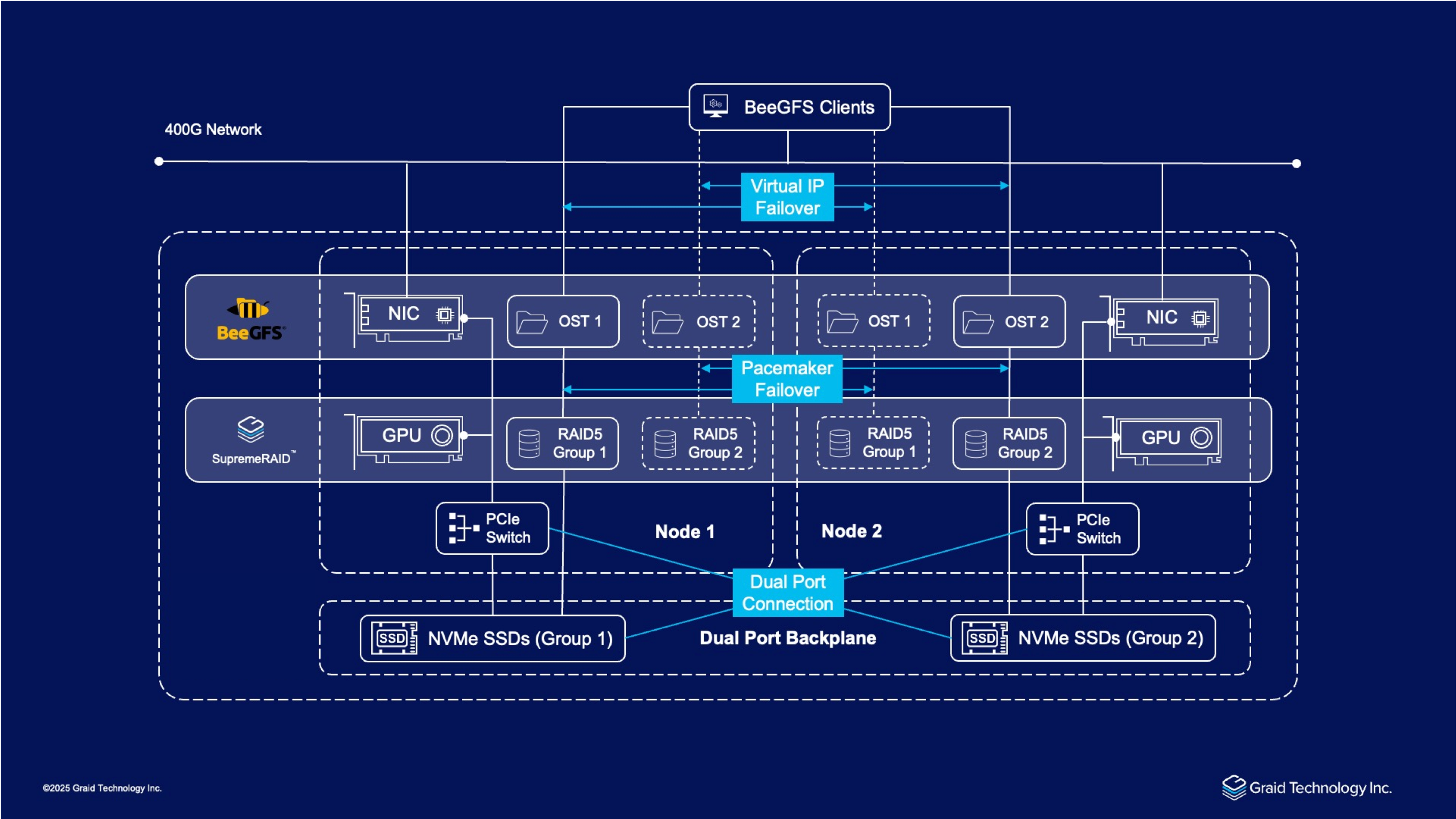 In today’s data-driven landscape, enterprises and high-performance computing (HPC) environments demand storage solutions that deliver exceptional speed, scalability, and resilience while optimizing cost-efficiency. Graid Technology introduces SupremeRAID™ HE, a cutting-edge GPU-accelerated NVMe RAID solution with array migration and cross-node high-availability (HA) capabilities, paired with a 2U all-flash Storage Bridge Bay (SBB) system and the BeeGFS parallel file system. Highlighting its performance, this architecture achieves the world’s highest throughput in a 2U system, saturating a 400Gb/s network with up to 132 GB/s read and 83 GB/s write locally, and up to 93 GB/s read and 84 GB/s write from the client side, while eliminating cross-node replication for cost savings and scaling seamlessly. Unlike advanced software RAID approaches, SupremeRAID™ HE leverages GPU parallelism to maximize NVMe performance, eliminate CPU bottlenecks, and reduce total cost of ownership (TCO). This whitepaper explores how this innovative design meets evolving demands.